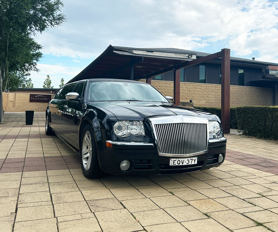 • Black Chrysler limo hire Wollongong for a sleek, modern vibe perfect for city nightlife